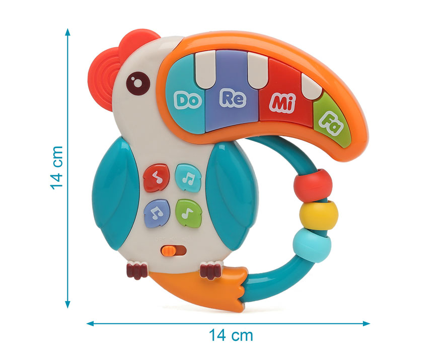 Nuestro tucán, aparte de ser bonito y muy colorido, es súper divertido. Además de algunas notas musicales, tiene 9 tipos de melodías y unos anillos para entretenerse antes de dormir o para jugar mientras pasea por el parque.